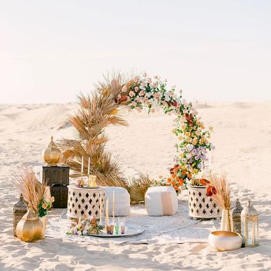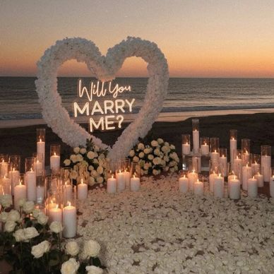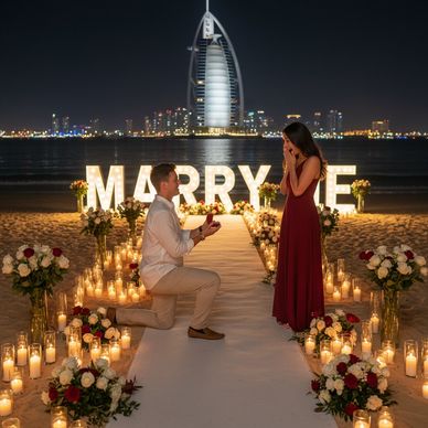 Dubai beach proposals feature pristine shores, sunset skies, luxury resorts, and gentle waves, offering a romantic seaside setting where barefoot moments, soft music, and ocean views make every proposal magical.